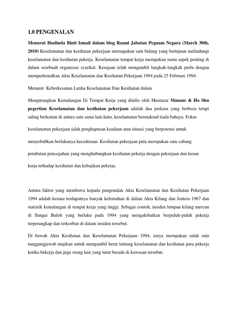 Doc Pengenalan Kepada Perundangan Keselamatan Dan Kesihatan Pekerja Di Malaysia Nor Izzah Talib Academia Edu